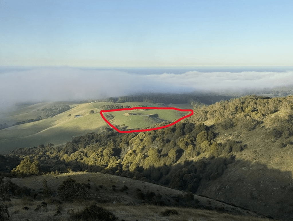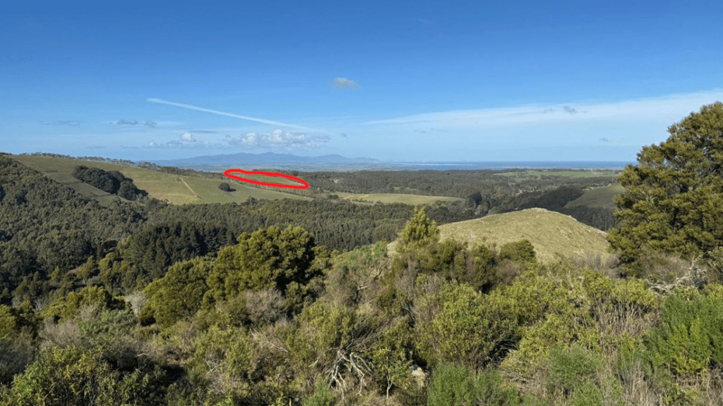 This is a view from the Hoddle Range looking toward Wilsons Prom. The red marked area is the site for the proposed quarry.
