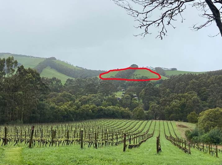 This view from Waratah Hills Winery looking north show the proposed mine site circled in red which will be clearly visible from the vineyard and cellar door. Several nearby growers are concerned about the impact the silica dust will have on their crops.